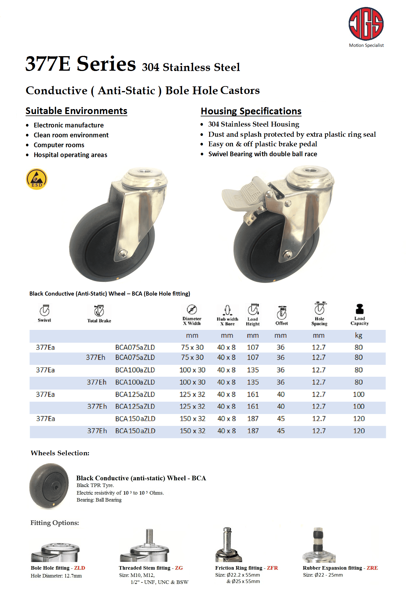 377 Series – Black Conductive (ESD) Stainless Steel Bole Hole Castors