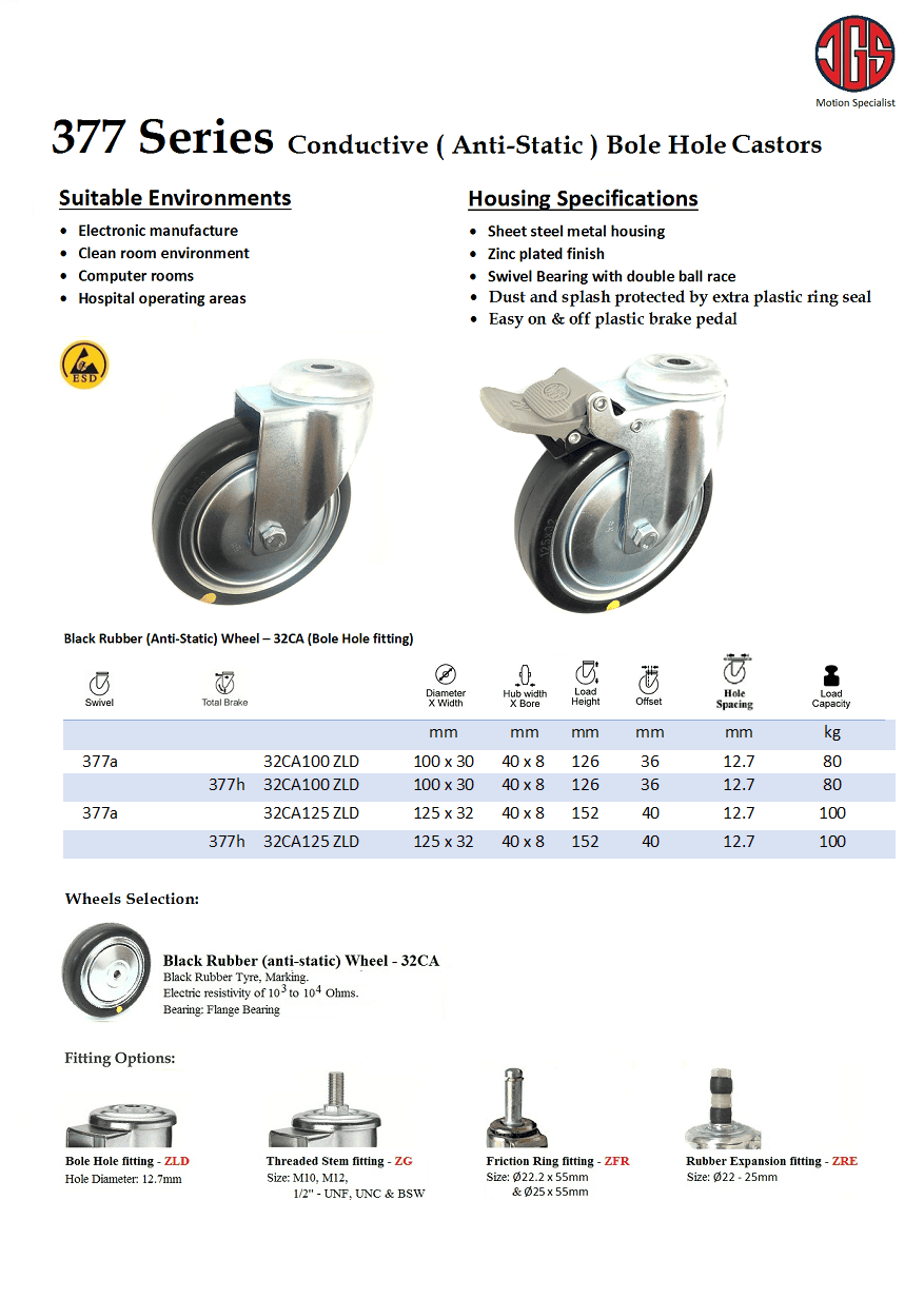 377 Series – Black Rubber Conductive (ESD) Bole Hole Castors
