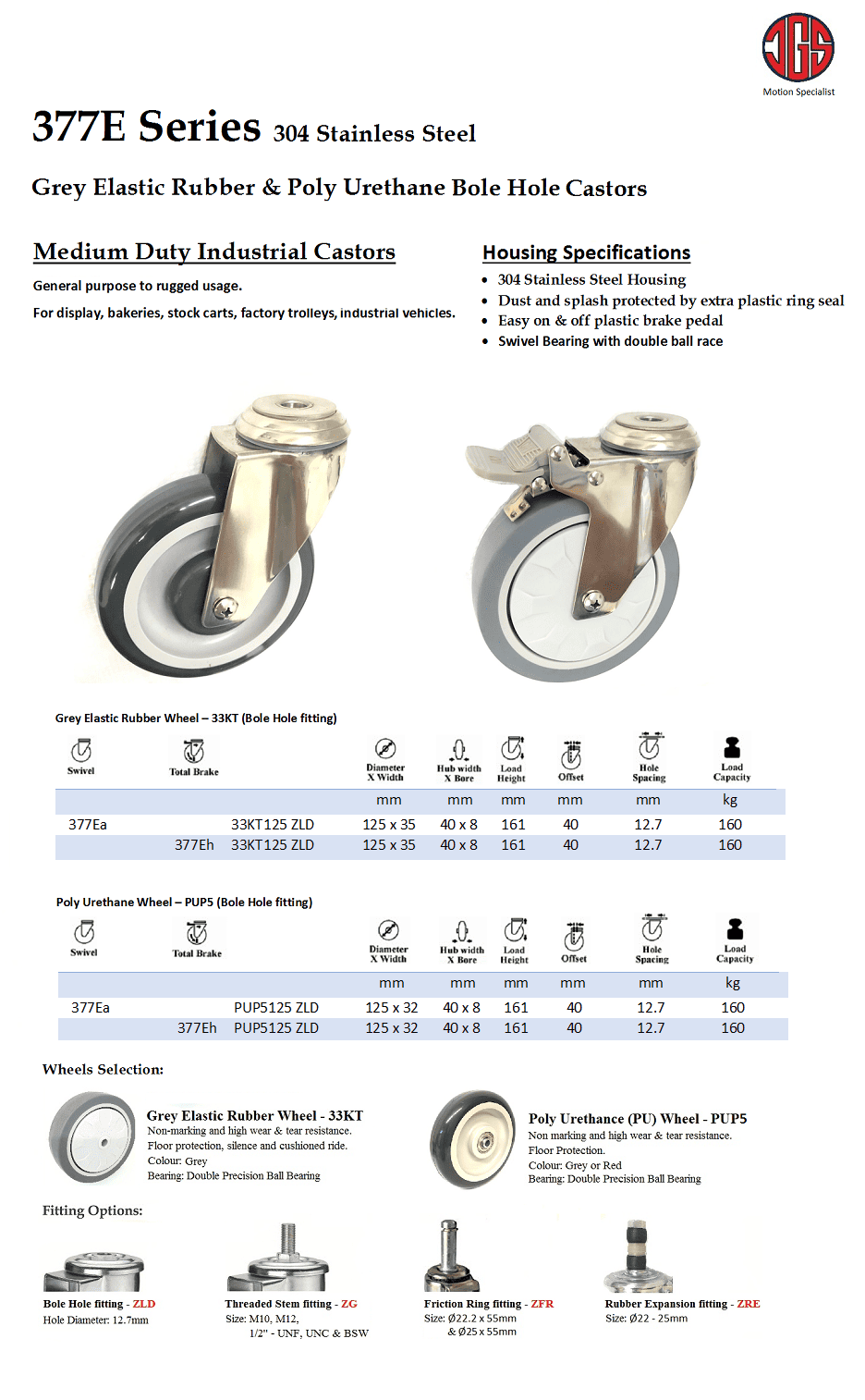 377 Series – Grey Elastic Rubber & Poly Urethane ( ETHER PU) Stainless Steel Bole Hole Castors