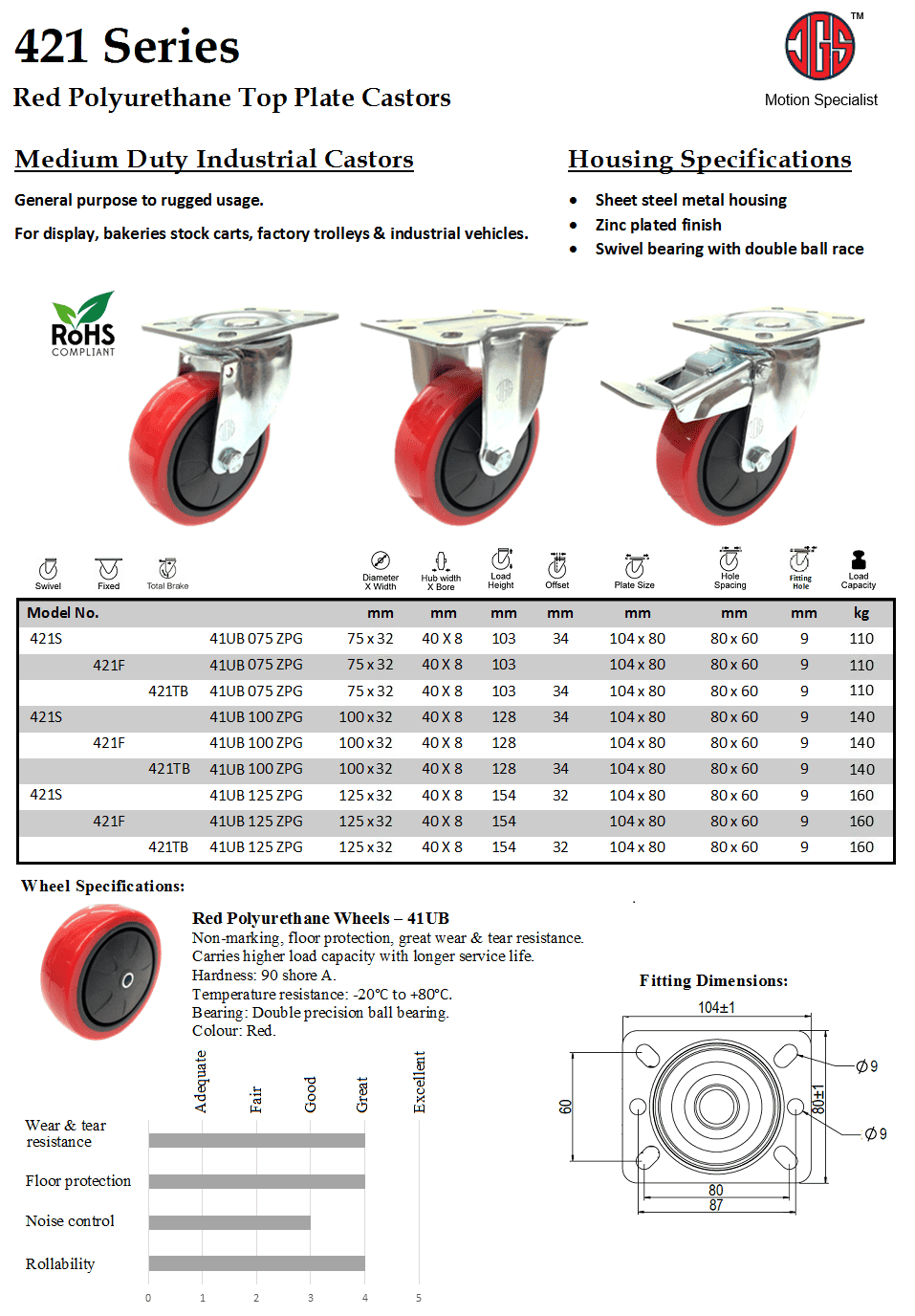 421 Series – Red Polyurethane Top Plate Castors