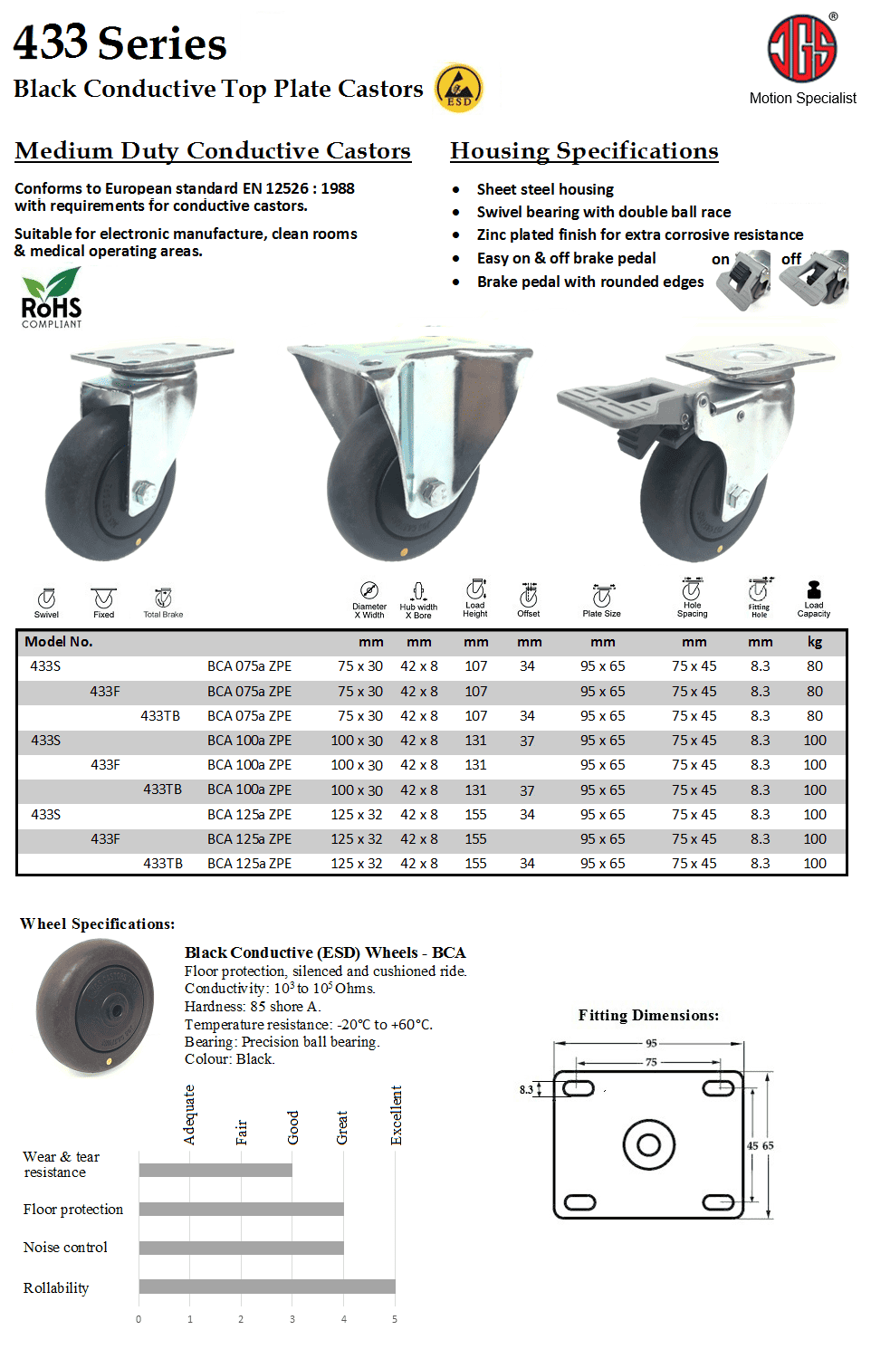 433 Series – Black Conductive (ESD) Top Plate Castors