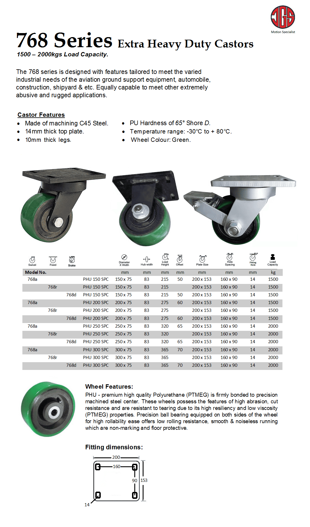 768 Series – Extra Heavy Duty PU Castors ( Load Capacity: 1,500 – 2,000kgs/pc )