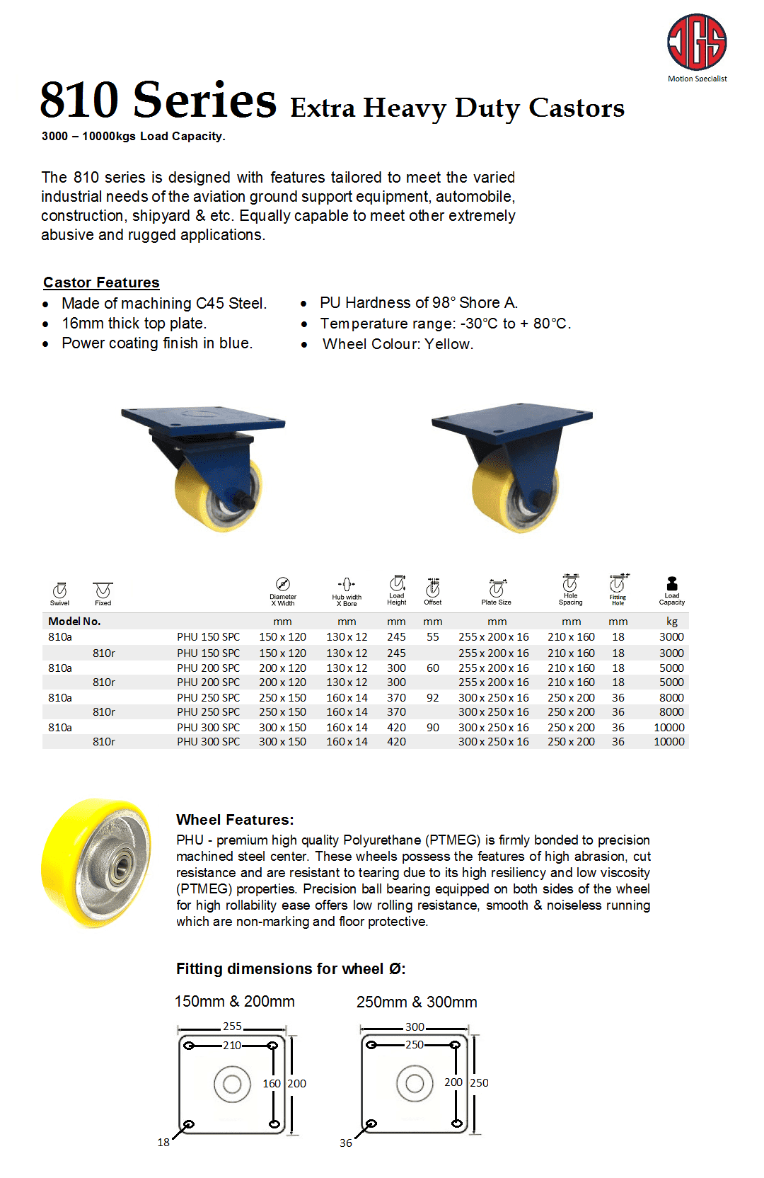 810 Series – Extra Heavy Duty PU Castors ( Load Capacity: 3,000 – 10,000kgs/pc )