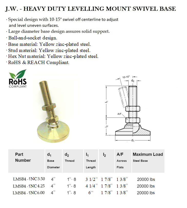 - Special design with 10º – 15º swivel off centerline to adjust and level uneven surfaces.